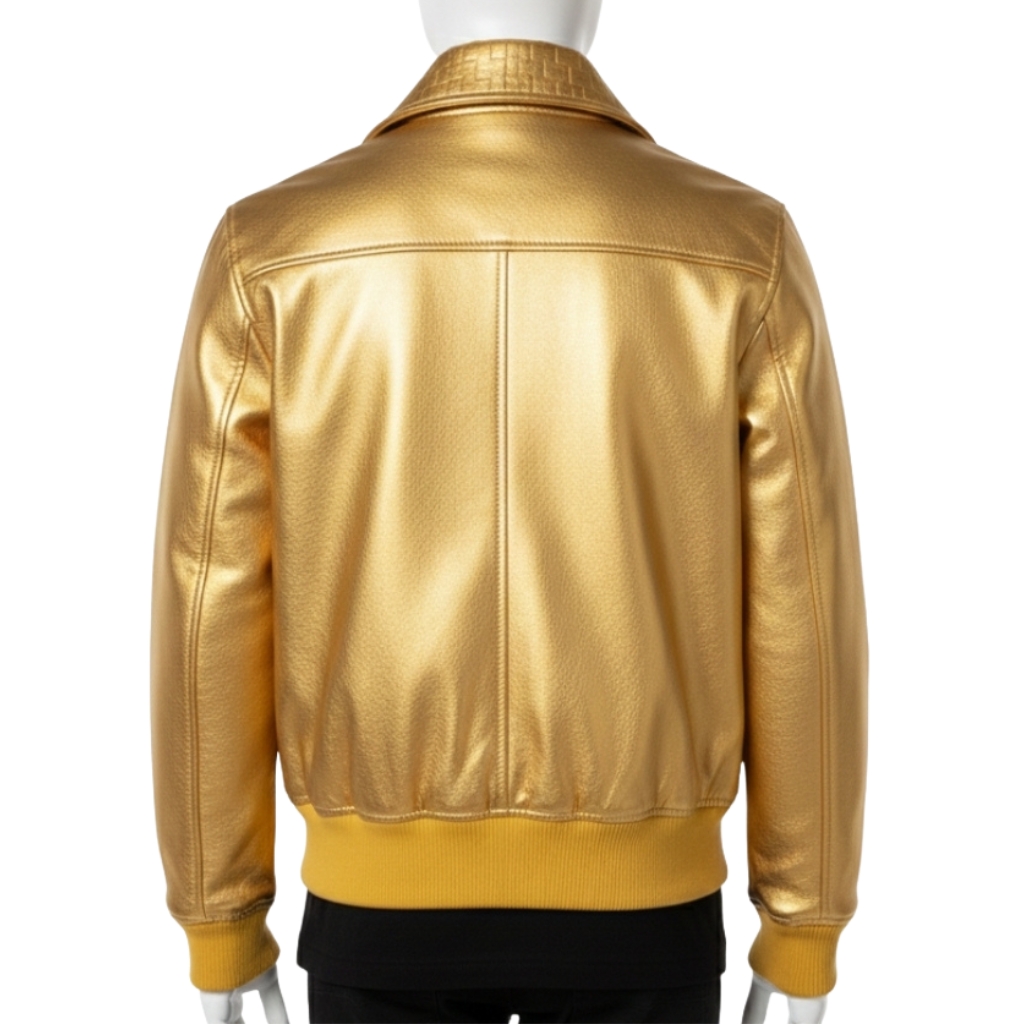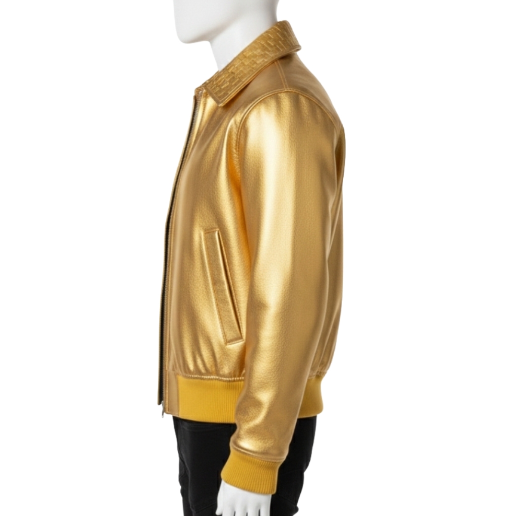 Refined Aesthetics: Unlike standard bomber jacket leather which can look flat, this combination of smooth, reflective gold and woven elements creates a look of undeniable luxury and opulence.