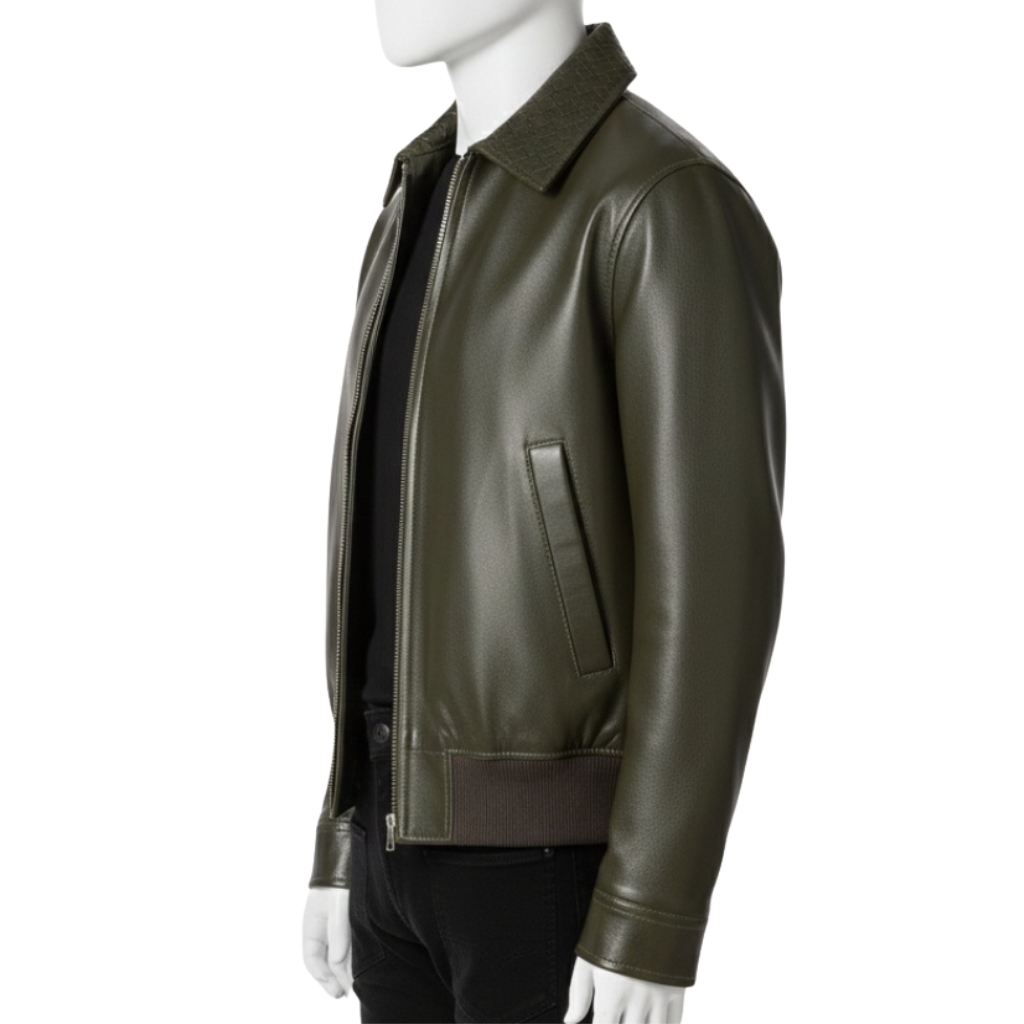 This leather bomber jacket mens style is finished in a deep, versatile Olive Green—a perfect alternative to black that pairs effortlessly with denim or tailored trousers.