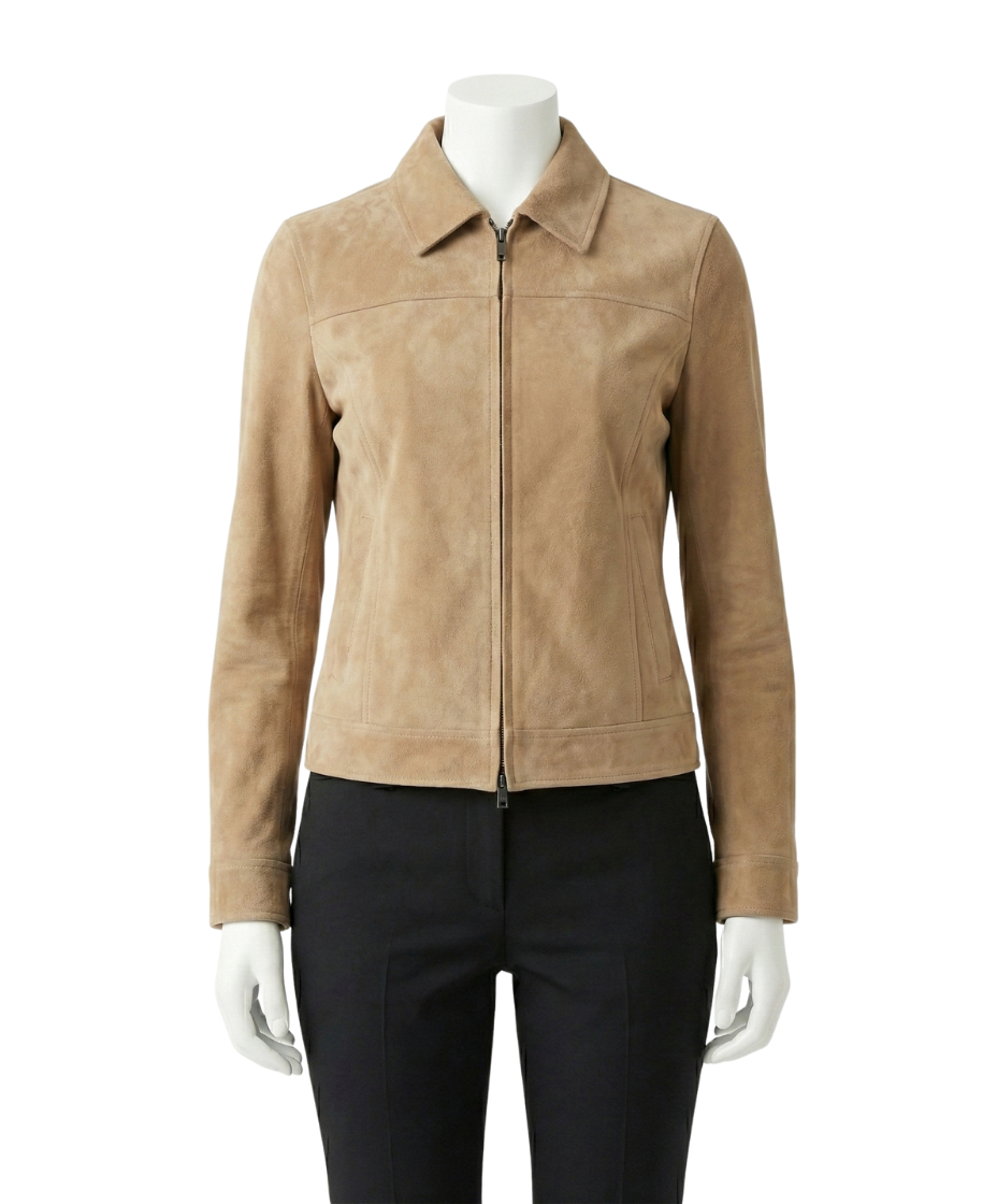A premium beige suede leather women jacket featuring a luxury tailored fit and handmade craftsmanship.