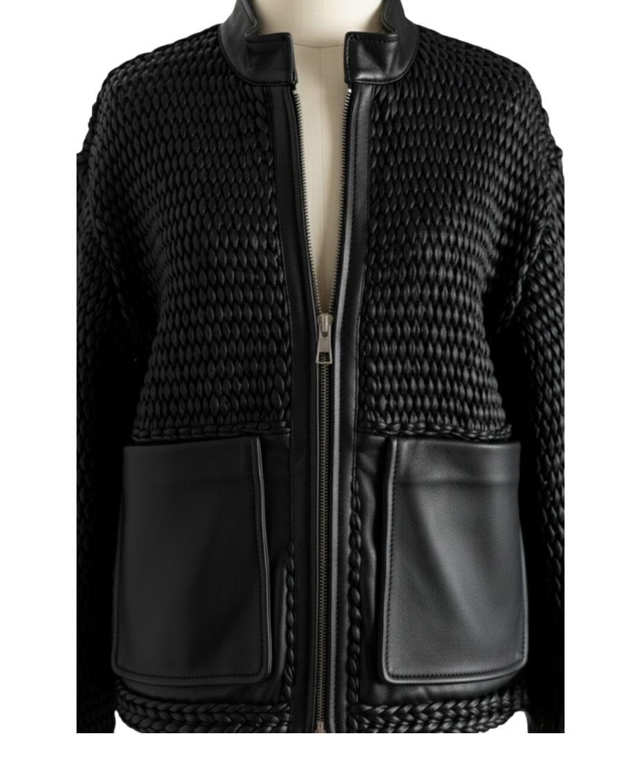 The muted matte black finish highlights the minimalist Cafe Racer silhouette and hand-woven texture. Specifically, each strip of Lambskin is carefully interlaced by our master craftsmen. This technique creates a multidimensional surface that reacts beautifully to light. Furthermore, the garment construction emphasizes durability alongside aesthetic appeal. Consequently, the artisanal touch is visible in every stitch. Therefore, this jacket represents a pinnacle of technical leatherwork.