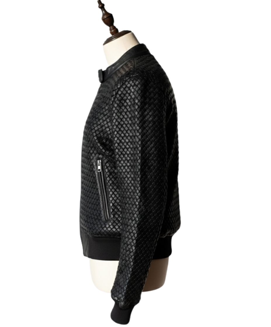 The deep onyx finish highlights the minimalist Cafe Racer silhouette and hand-woven texture. Specifically, each strip of Goatskin is carefully interlaced by our master craftsmen. This technique creates a multidimensional surface that reacts beautifully to light. Furthermore, the garment construction emphasizes durability alongside aesthetic appeal. Consequently, the artisanal touch is visible in every stitch. Therefore, this jacket represents a pinnacle of technical leatherwork.