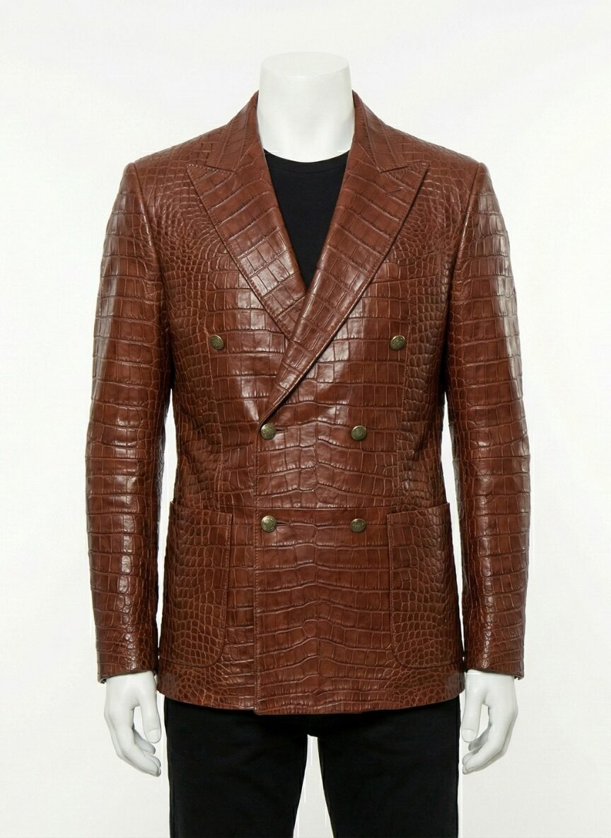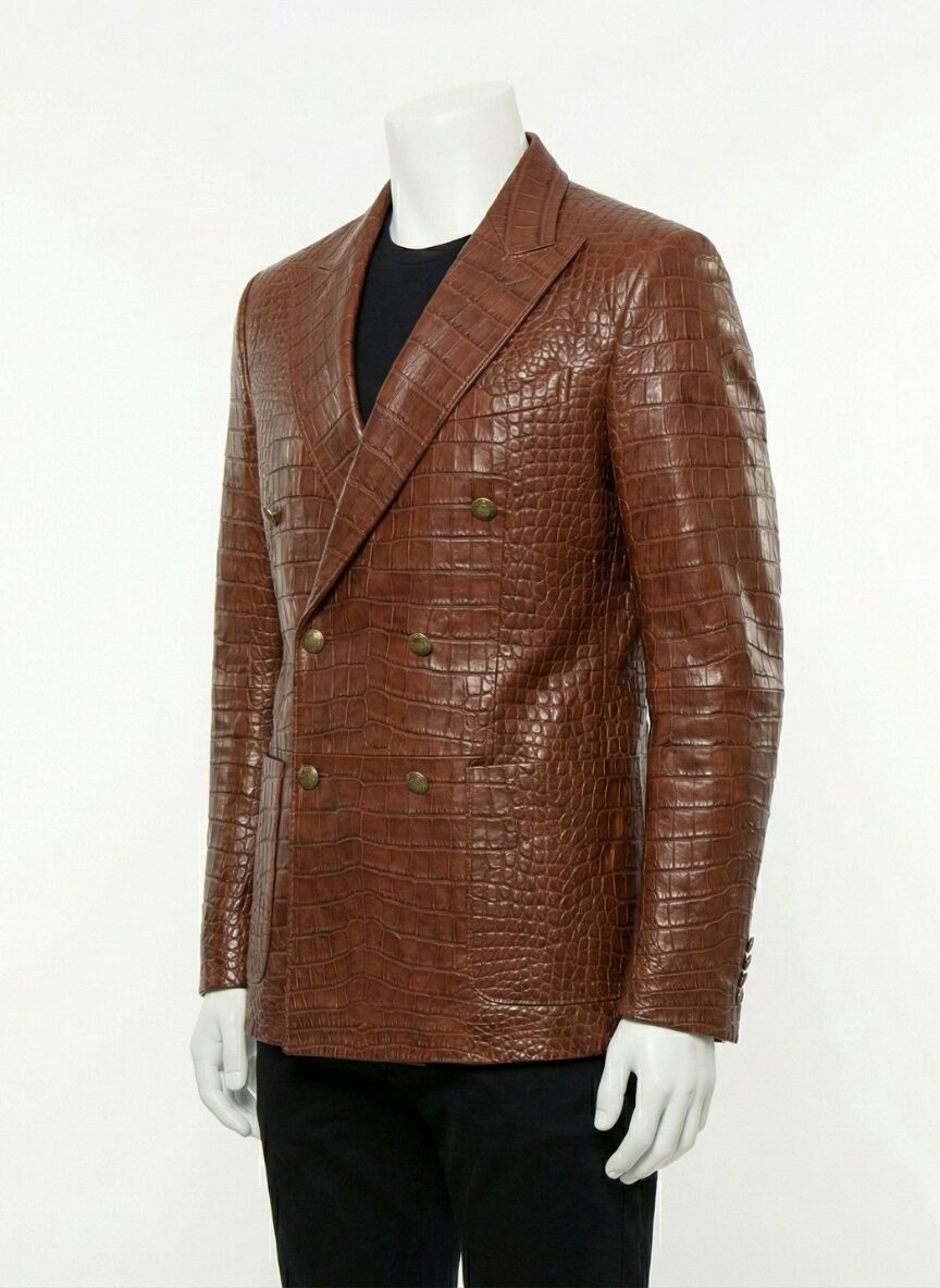 The jacket features a rich mens brown leather coat finish. Every inch showcases a detailed crocodile skin embossment. Specifically, the textured surface reflects a sophisticated masculine aesthetic. Moreover, the double-breasted button closure adds a classic formal edge. This construction creates a bold architectural silhouette. Therefore, the texture feels both luxurious and substantial.