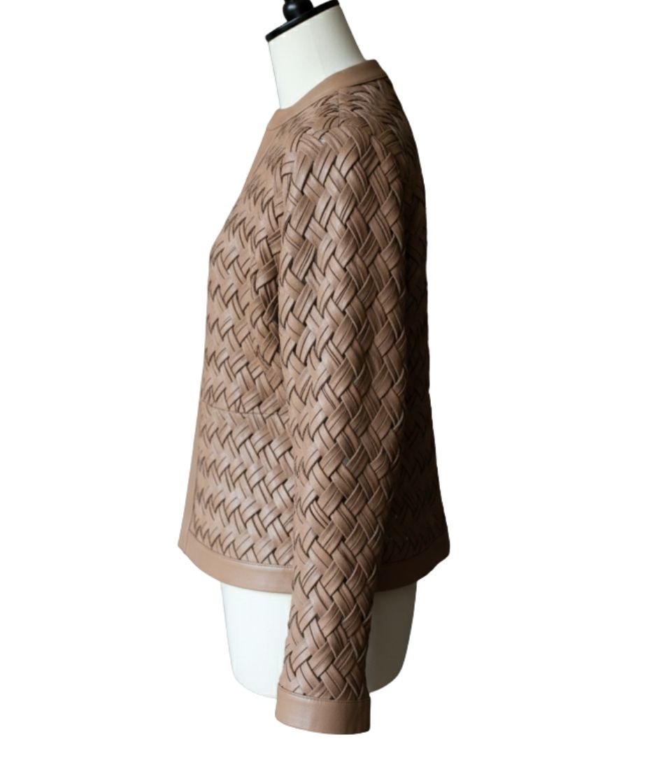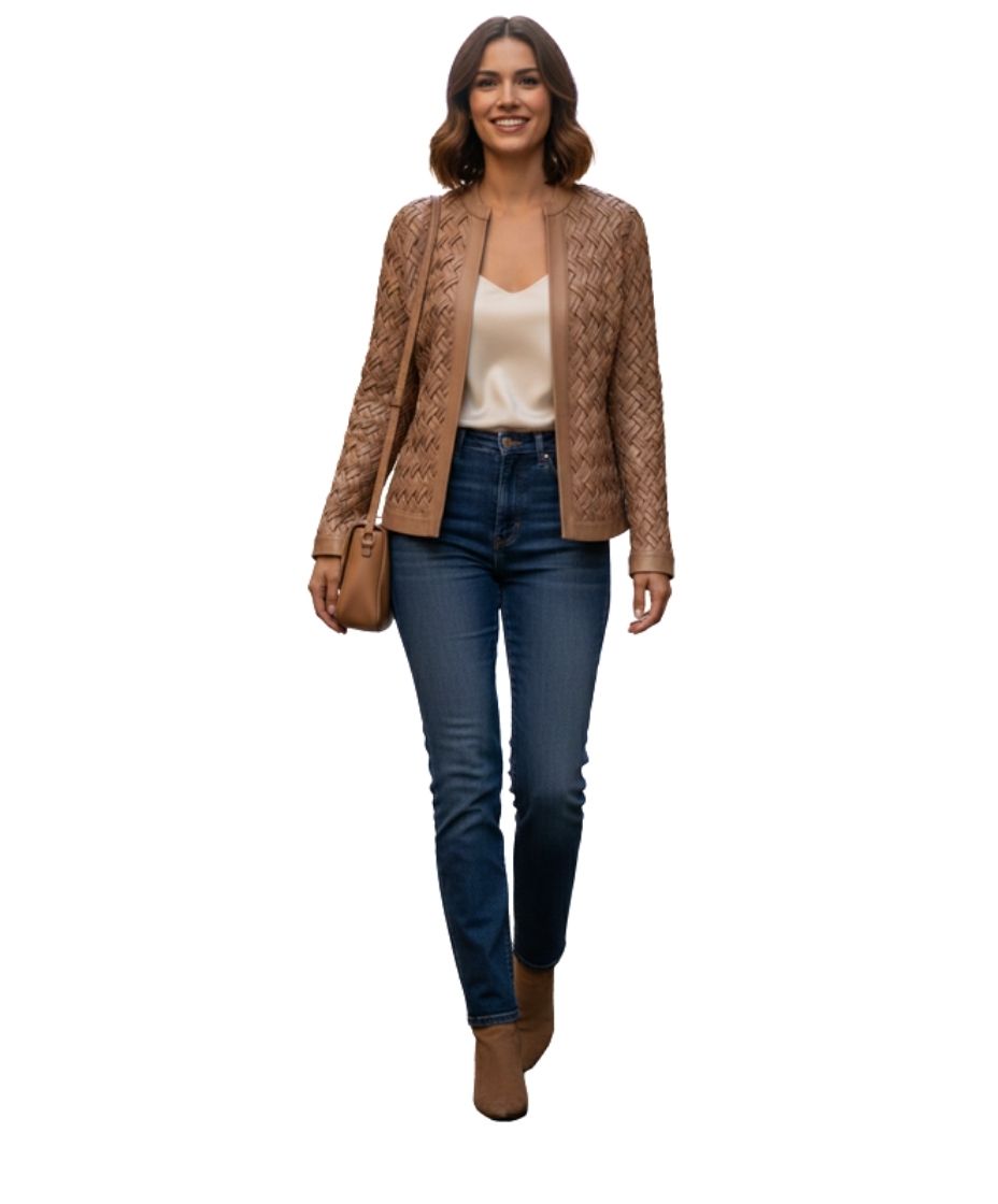 BROWNISH BEIGE WOVEN LEATHER CAFE RACER JACKET WOMEN