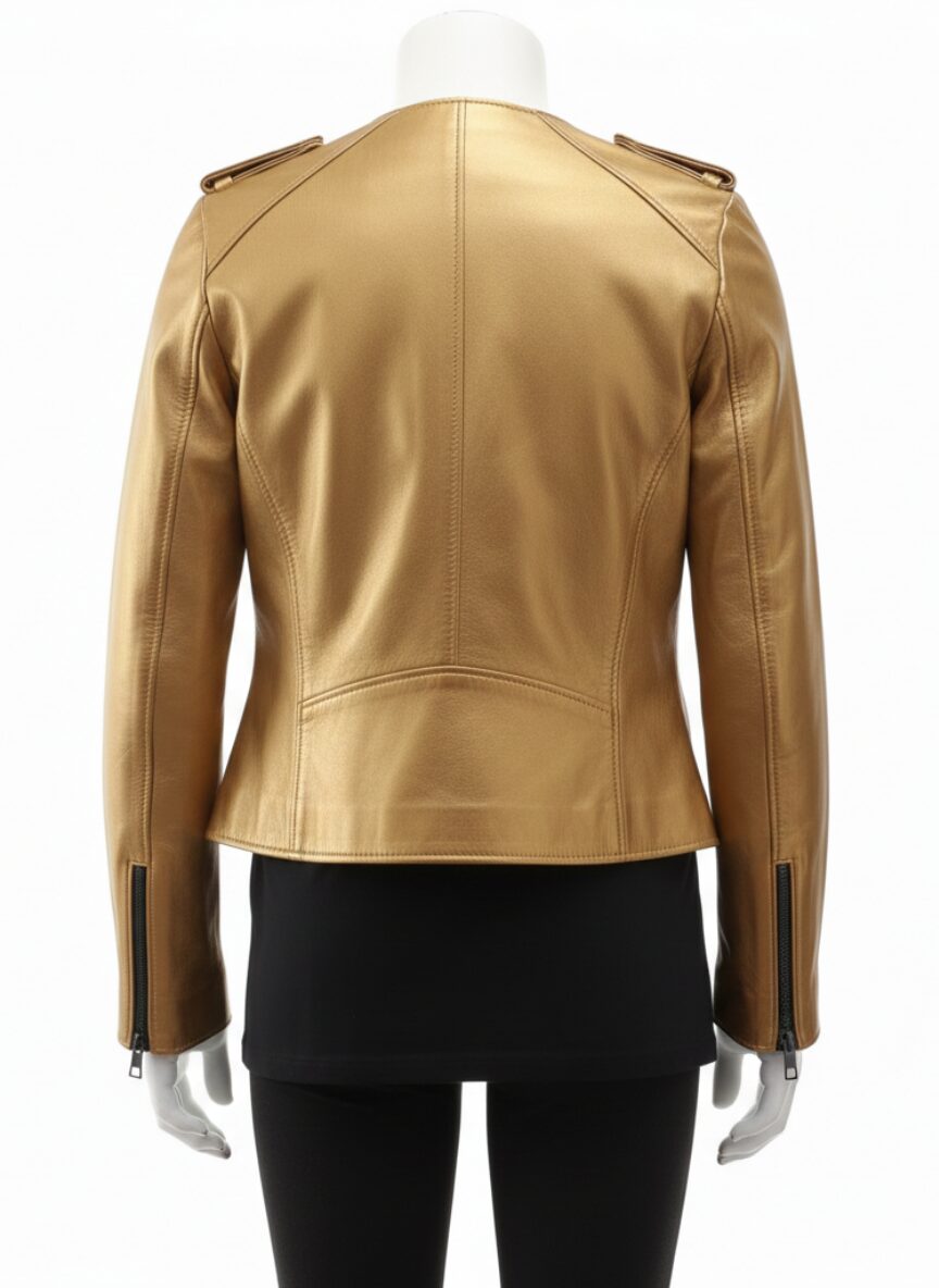The jacket features a striking metallic gold finish. Moreover, every inch showcases an intricate biker leather jacket women texture. Specifically, this handcrafted artisan construction reflects light with every movement. Therefore, the biker leather jacket women feels both luxurious and substantial.