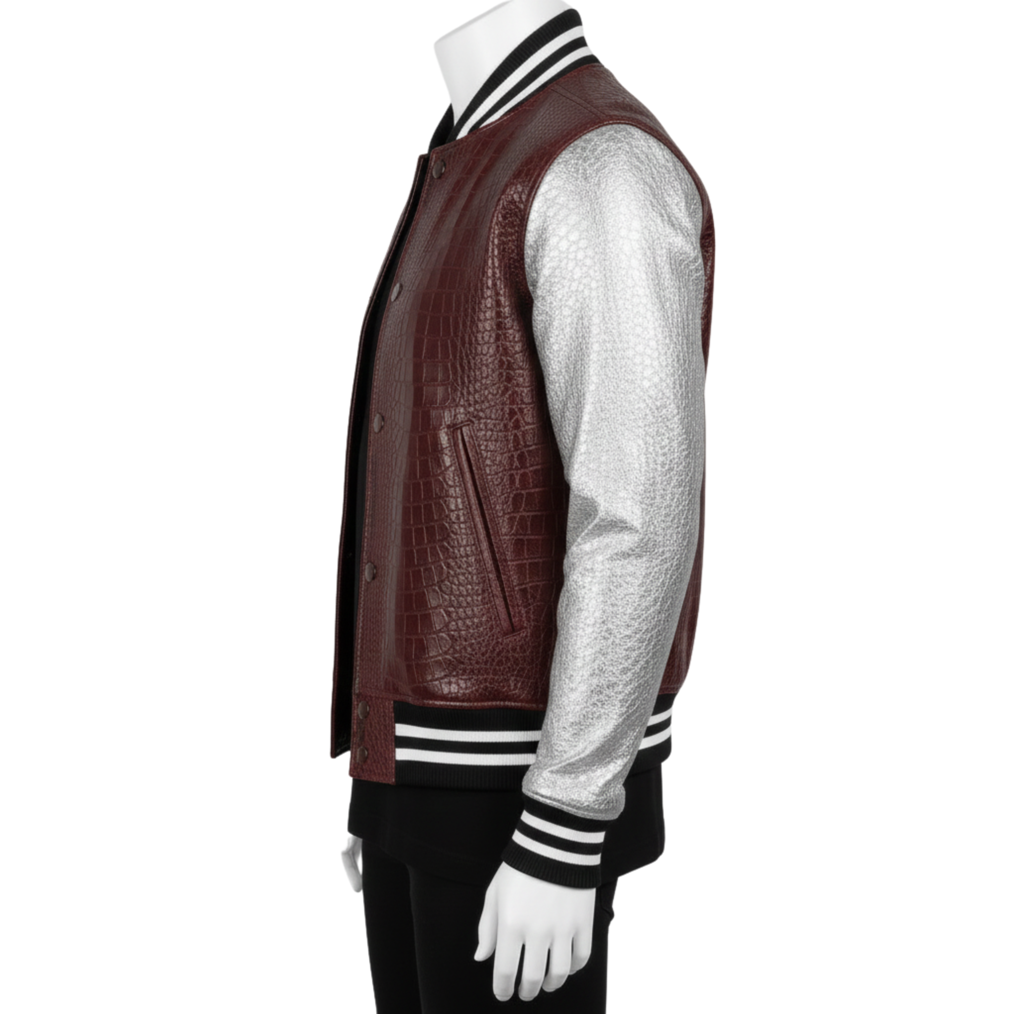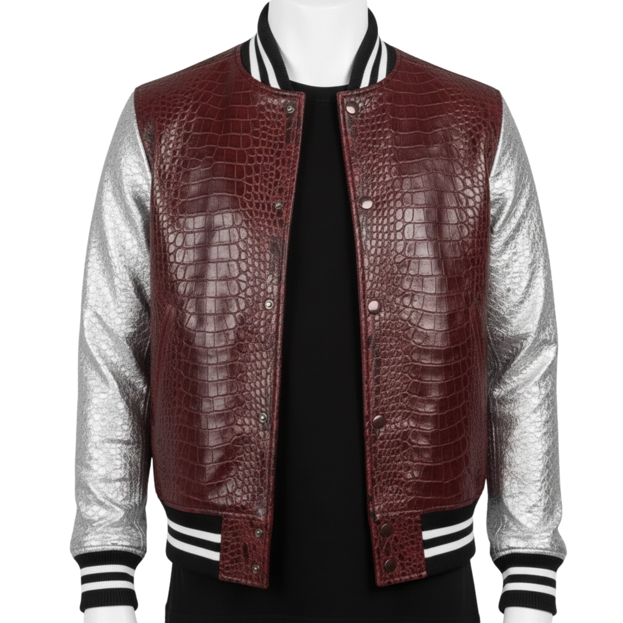 MAROON AND SILVER CROCODILE LEATHER VARSITY JACKET