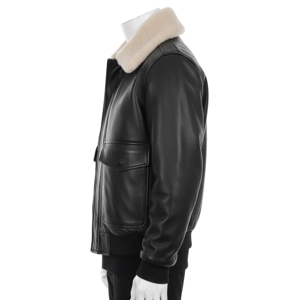 MENS BLACK LEATHER AVIATOR JACKET | White Shearling Collar