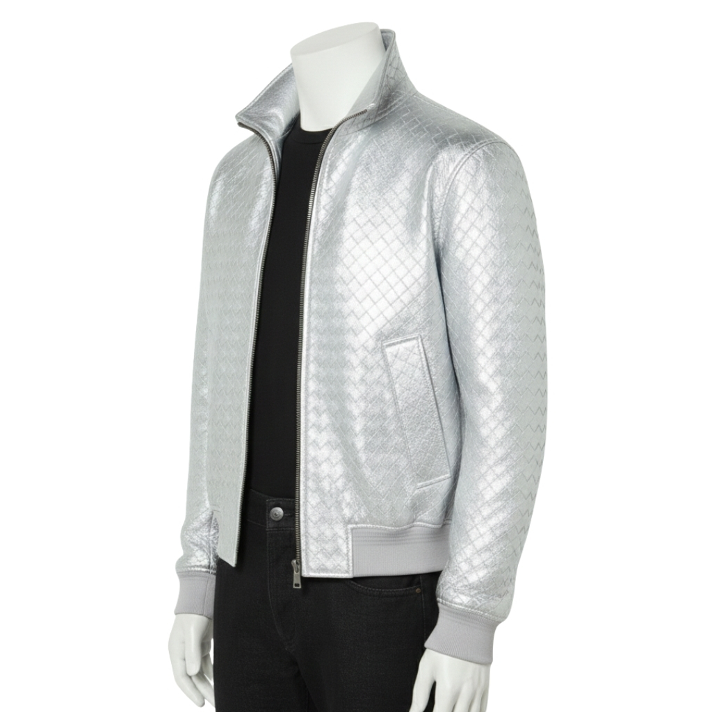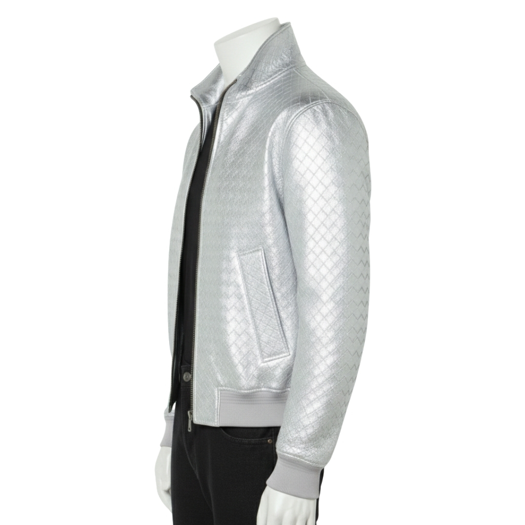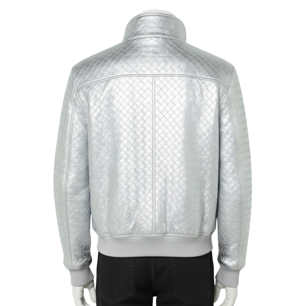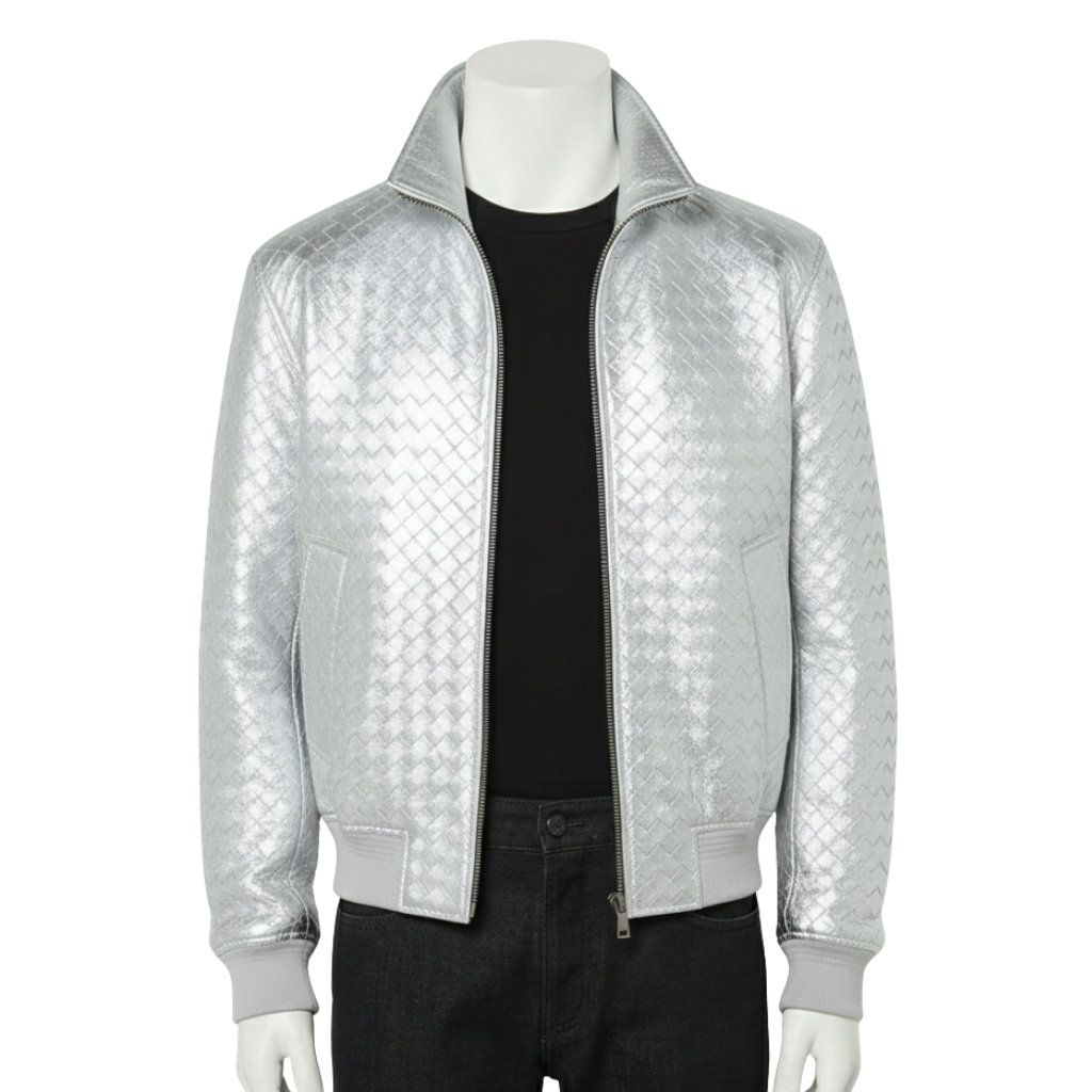 METALLIC SILVER MEN LEATHER BOMBER JACKET | Woven Leather Edition