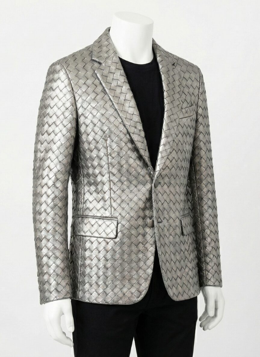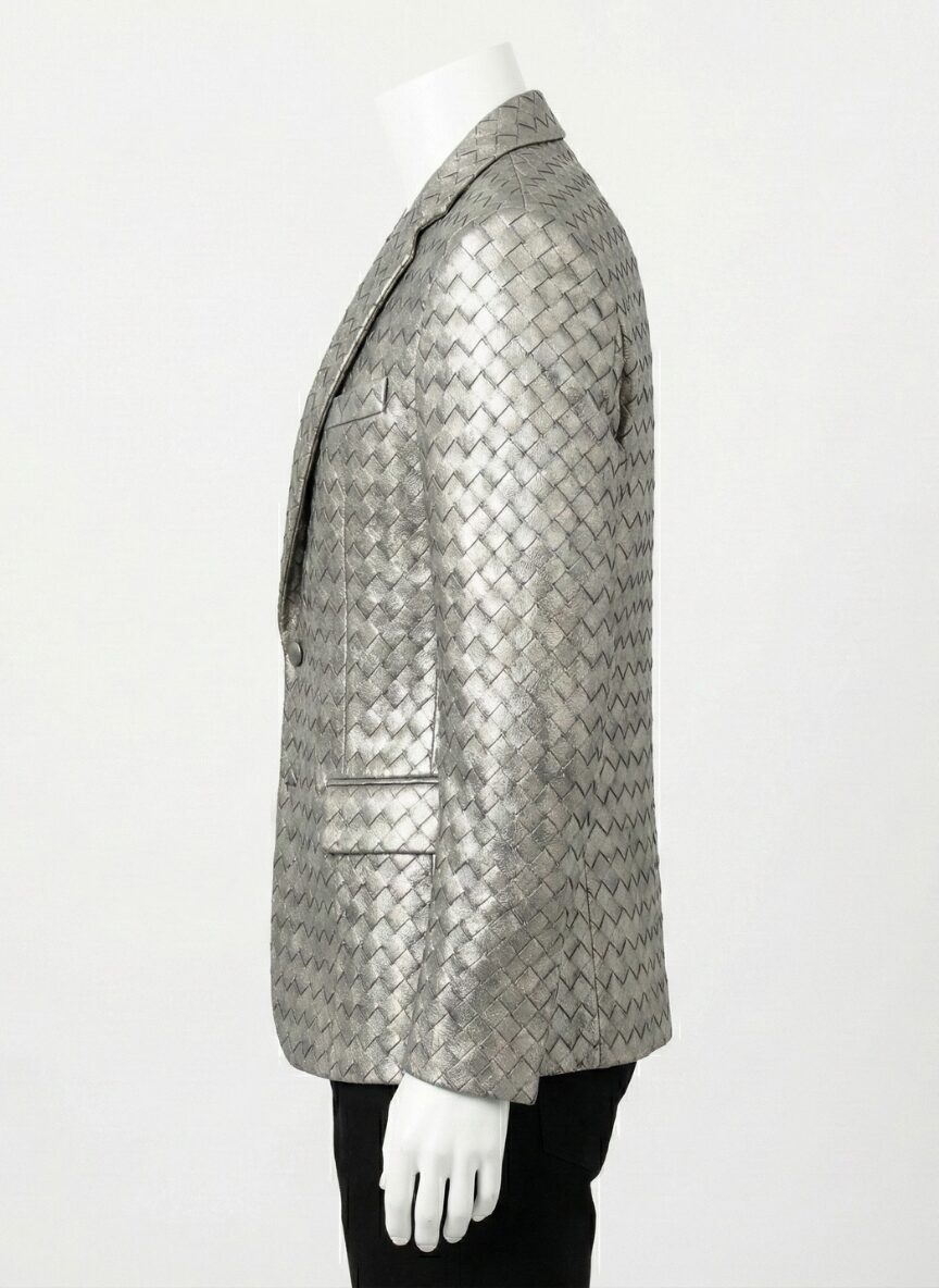 The jacket features a striking metallic silver finish. Every inch showcases an intricate hand-woven leather texture. Specifically, the artisan weaving reflects light with every movement. Moreover, the classic blazer lapels add a modern sophisticated edge. This construction creates a bold architectural silhouette. Therefore, the texture feels both luxurious and substantial.