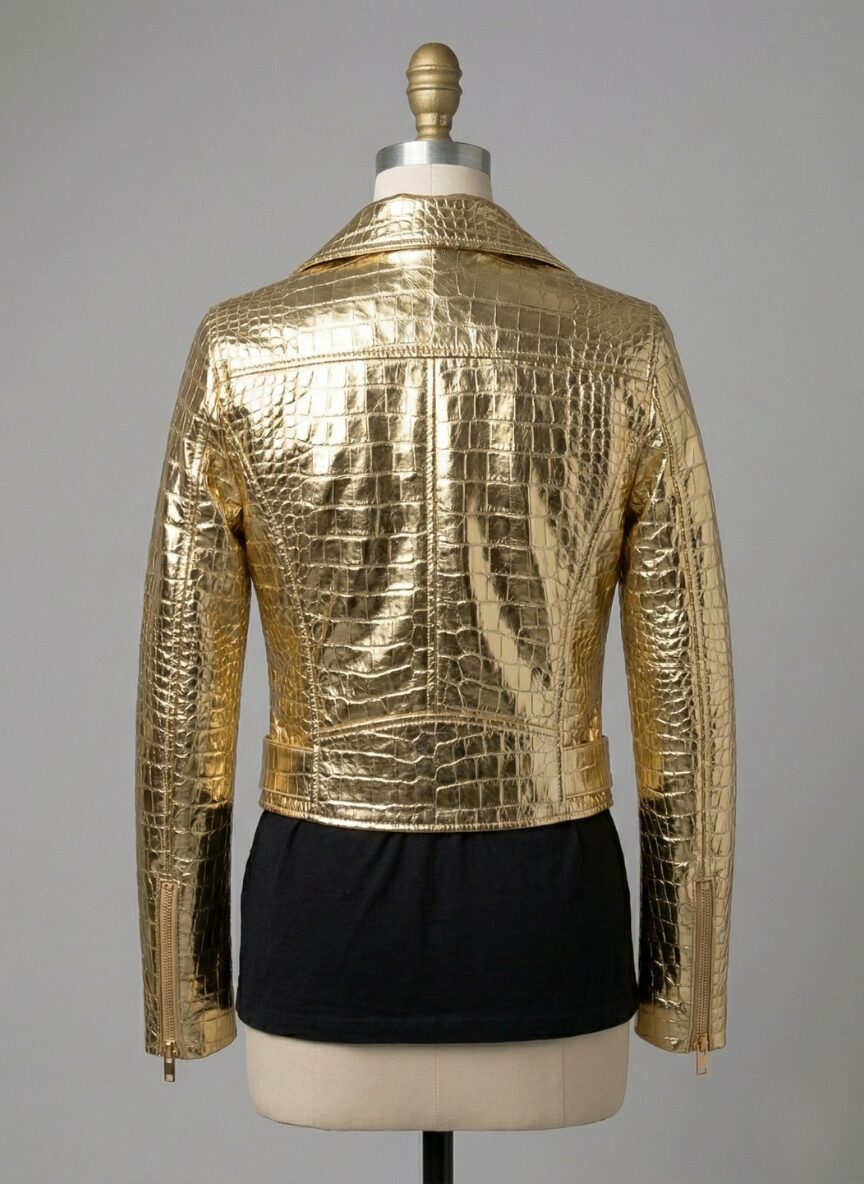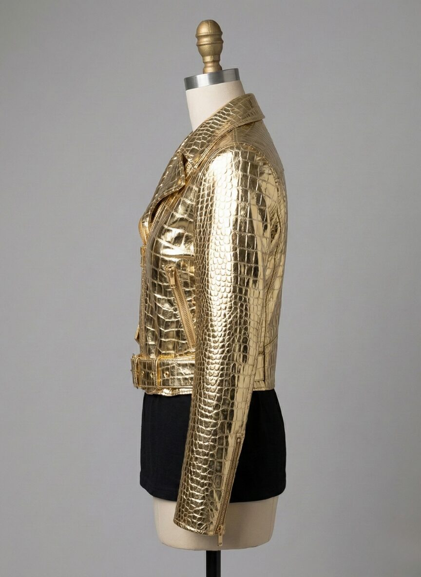 The jacket features a striking metallic gold finish on a crocodile texture. Moreover, every inch showcases an intricate women's leather biker jacket silhouette. Specifically, this artisan construction reflects light with every movement. The 100% handmade narrative guarantees a unique garment. Therefore, the women's leather biker jacket construction feels both premium and substantial.