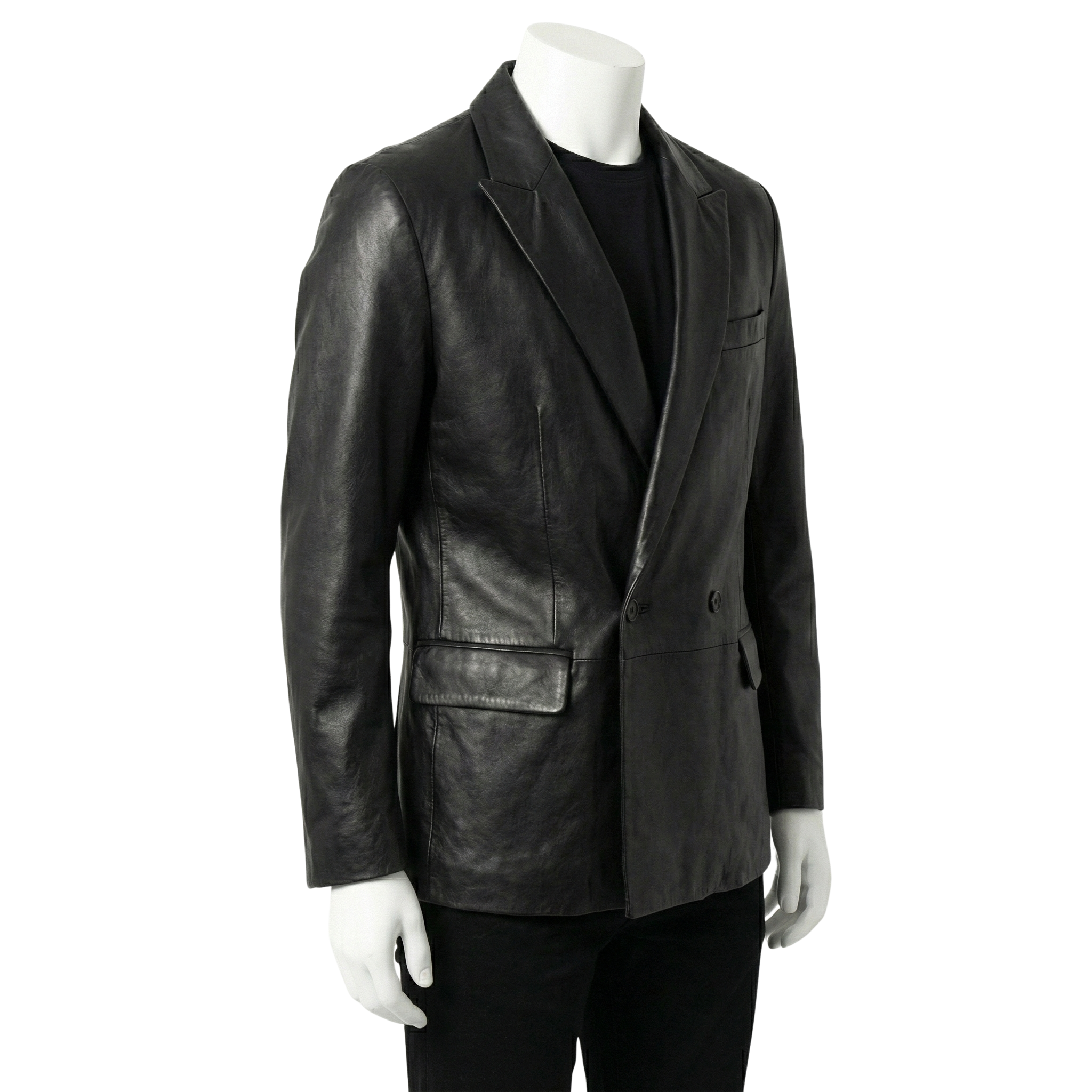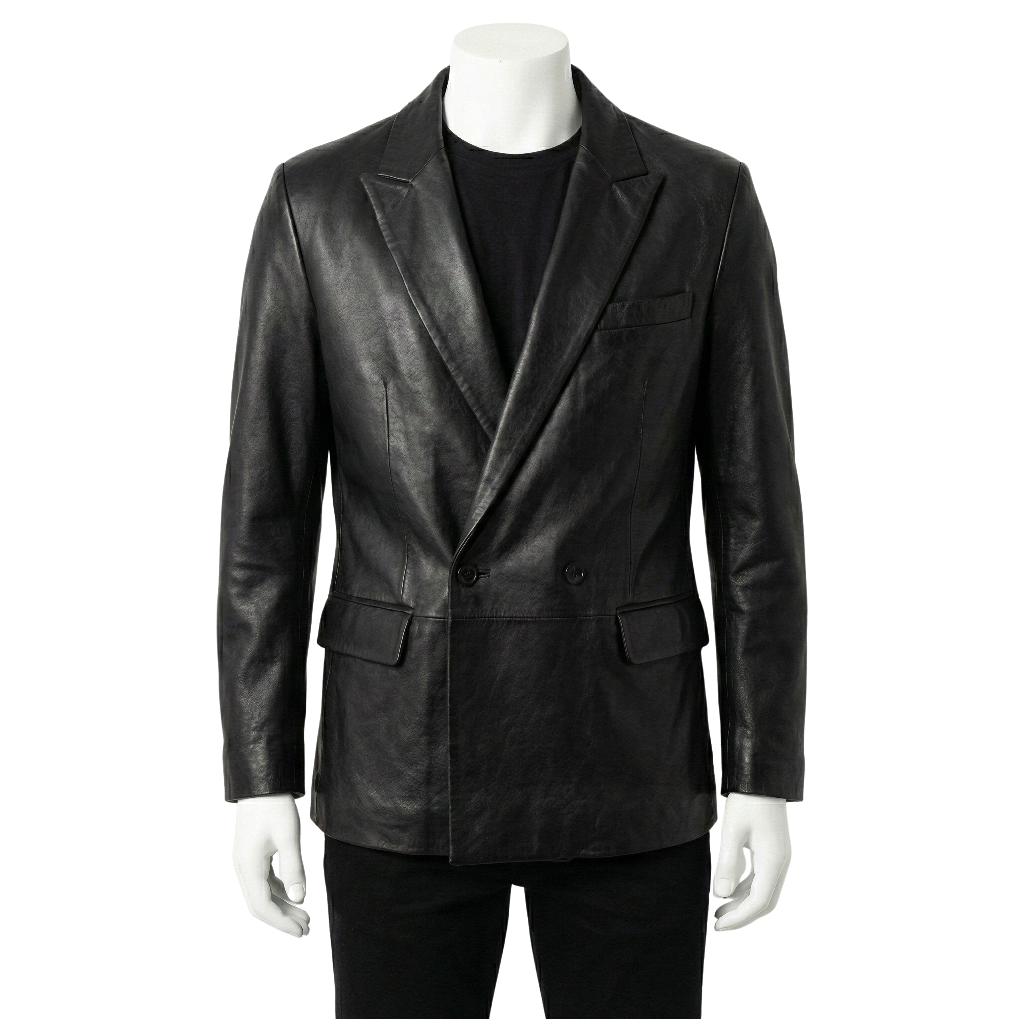 The jacket features a sleek midnight finish. Specifically, the smooth leather surface offers a clean and timeless aesthetic. The high-quality hide reflects a sophisticated masculine style. Moreover, the double-breasted button closure adds a classic formal edge. This construction creates a bold architectural silhouette. Therefore, the texture feels both luxurious and substantial.