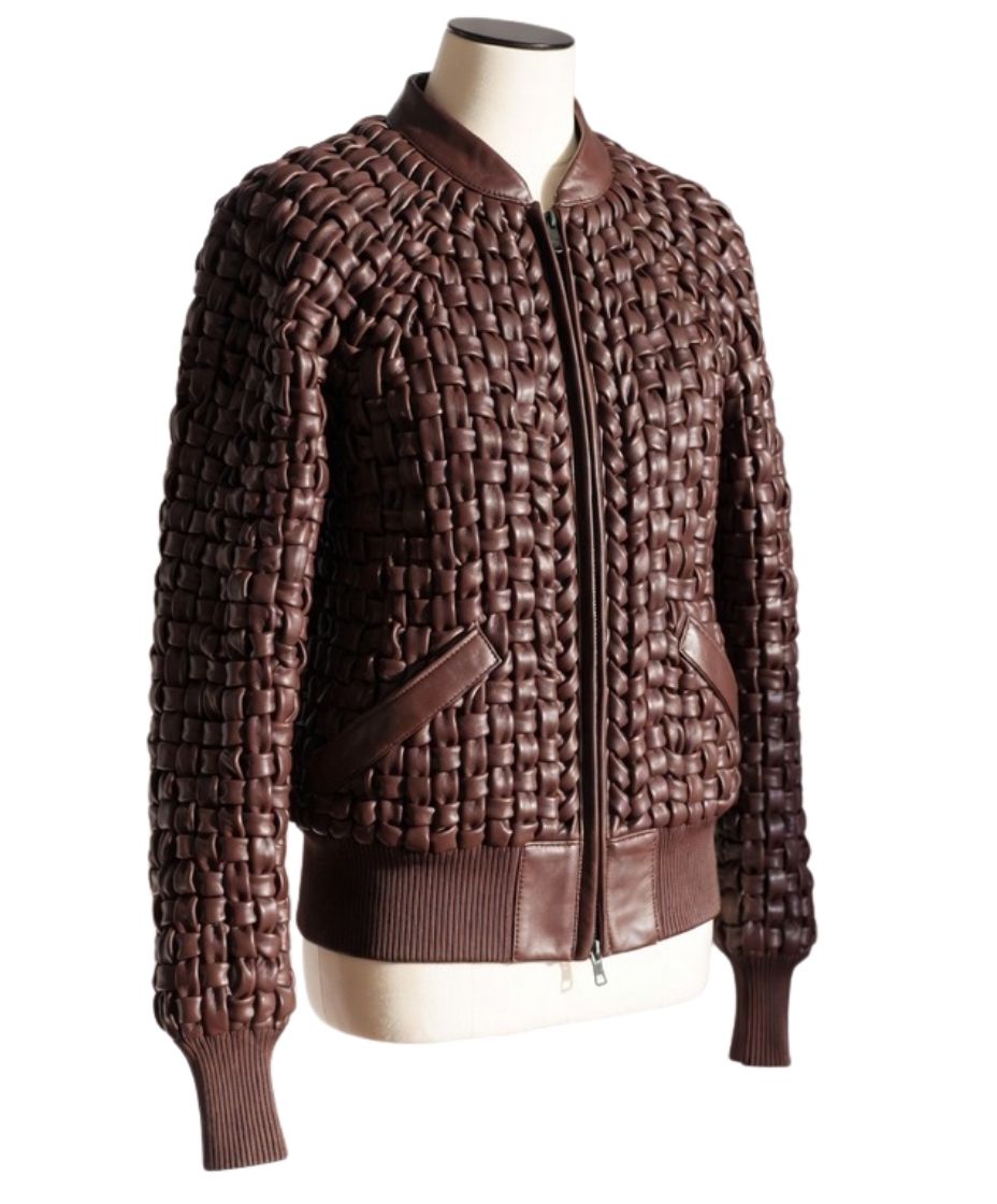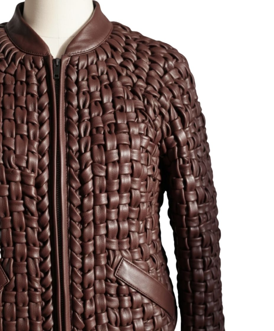 The warm reddish-brown tones highlight the minimalist Cafe Racer silhouette and hand-woven texture. Specifically, each strip of Full-grain leather is carefully interlaced by our master craftsmen. This technique creates a multidimensional surface that reacts beautifully to light. Furthermore, the garment construction emphasizes durability alongside aesthetic appeal. Consequently, the artisanal touch is visible in every stitch. Therefore, this jacket represents a pinnacle of technical leatherwork.