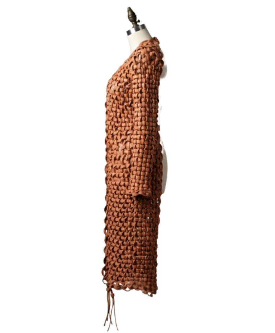 The rich saddle brown finish highlights the elongated silhouette and intricate hand-woven texture. Specifically, each strip of Full-grain leather is interlaced by hand. This process creates a unique and durable multidimensional surface. Furthermore, our master craftsmen ensure a 100% handmade narrative in every stitch. Therefore, the garment reflects a legacy of traditional skills. Consequently, the quality rivals the most famous fashion houses.